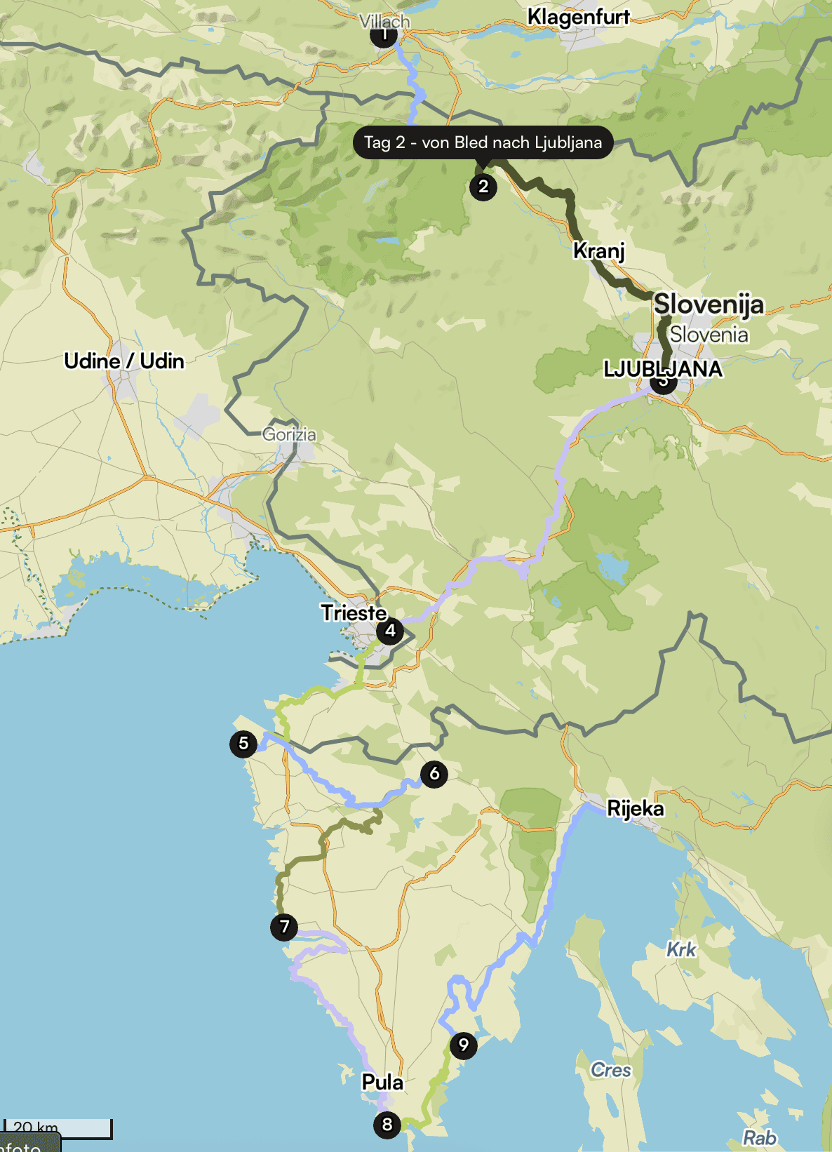 Dies ist der Überblick über die gesamte Tour – vom Alpenrand über Hügel und Küstenstraßen bis nach Istrien.